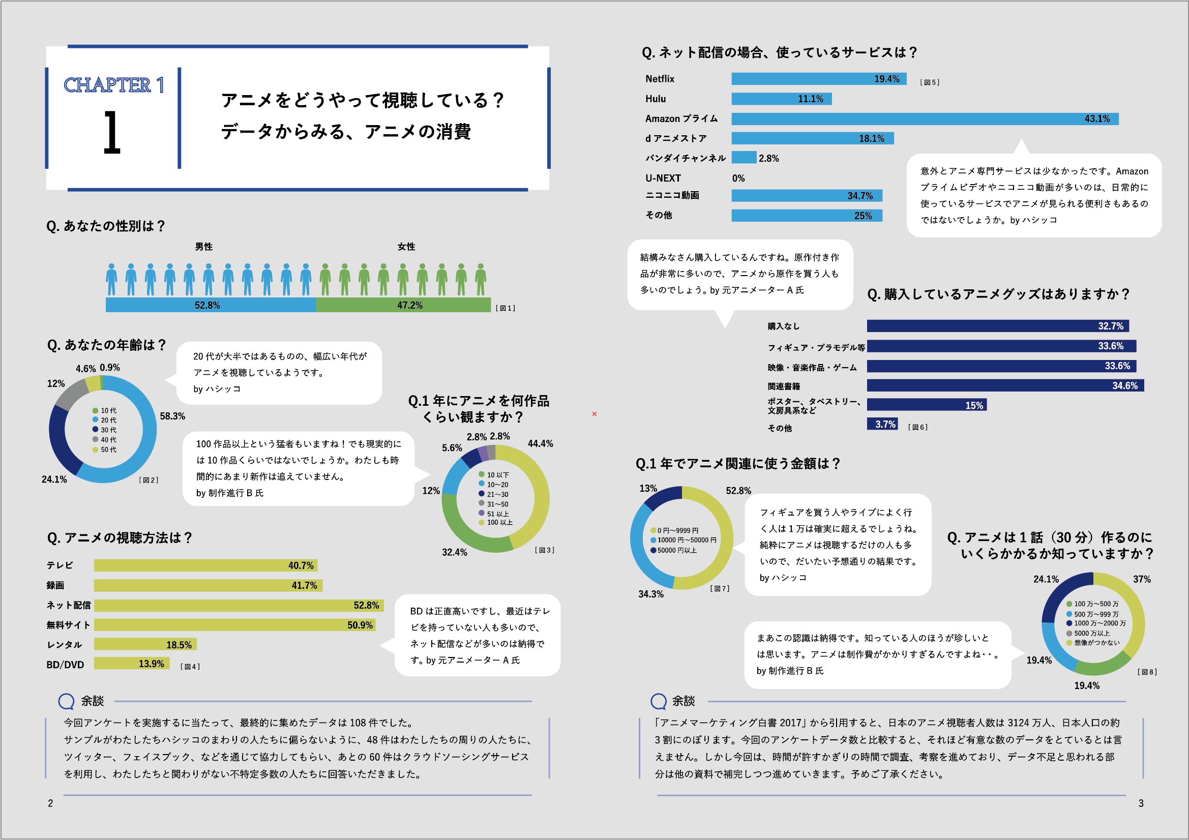 事前にわたしたちの周りにアンケートを行い、その結果からいまのアニメの消費に対する考え方を考察してみました。 グラフやアニメ制作サイドの意見を交えながら、どのような傾向があるのか、調査していきたいと思います。