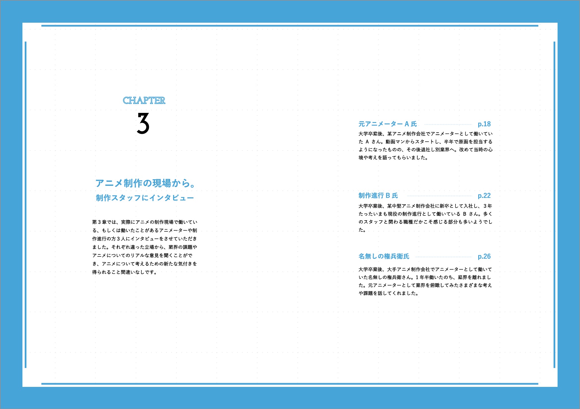 実際にアニメの制作現場で働いている、もしくは働いたことがあるアニメーターや制作進行の方3人にインタビューをさせていただきました。それぞれ違った立場から、業界の課題やアニメについてのリアルな意見を聞くことができ、アニメについて考えるための新たな気付きを得られること間違いなしです。